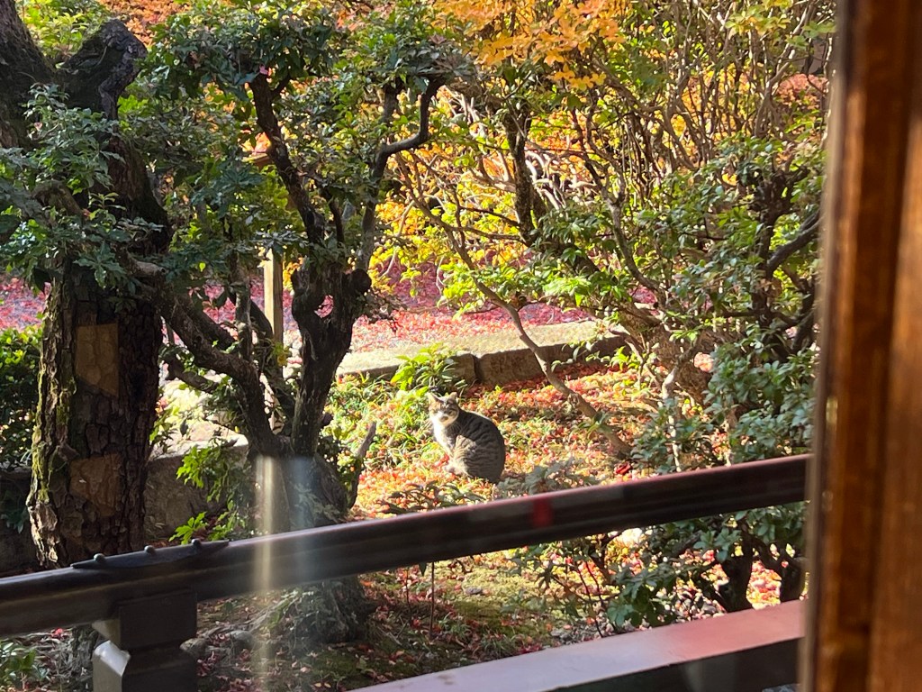 この朝食会場が離れにあるのですが、お庭がよく見えるところで。猫が来ていて可愛かった思い出。