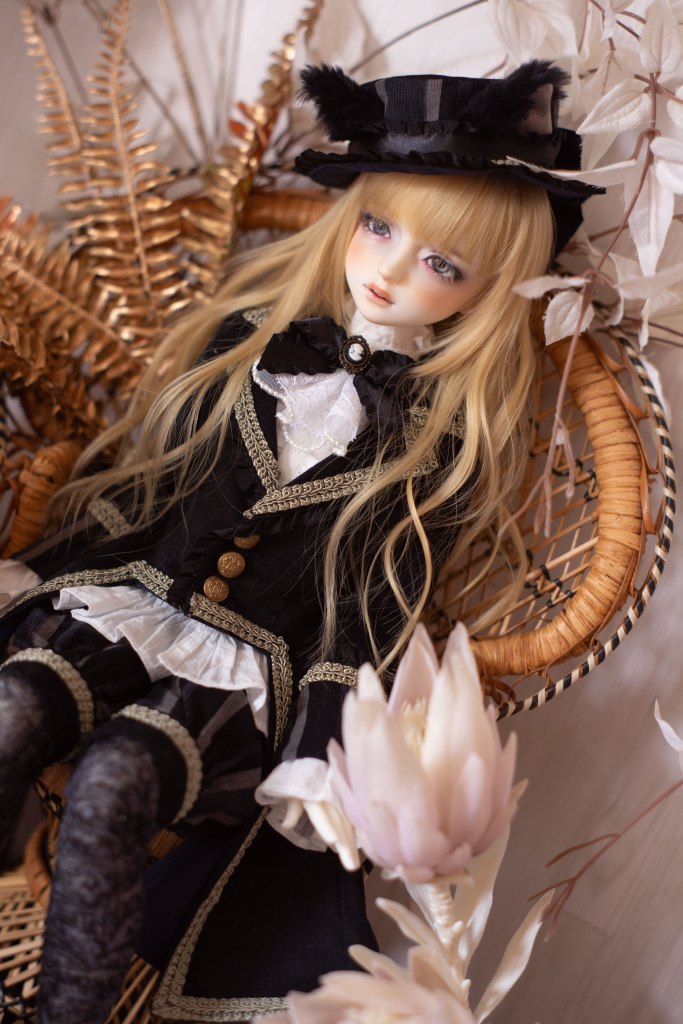 そしてこちらのドレスはりおさんのゴシックスーツ。細かいところまでとても丁寧に仕上げられていて、お気に入りの一着です。黒いコーデュロイと柔らかい白のフリルのコントラストに渋金のブレードが華やかで、どんな背景にも合いそうです。猫耳つきのハットも大ぶりで可愛い!