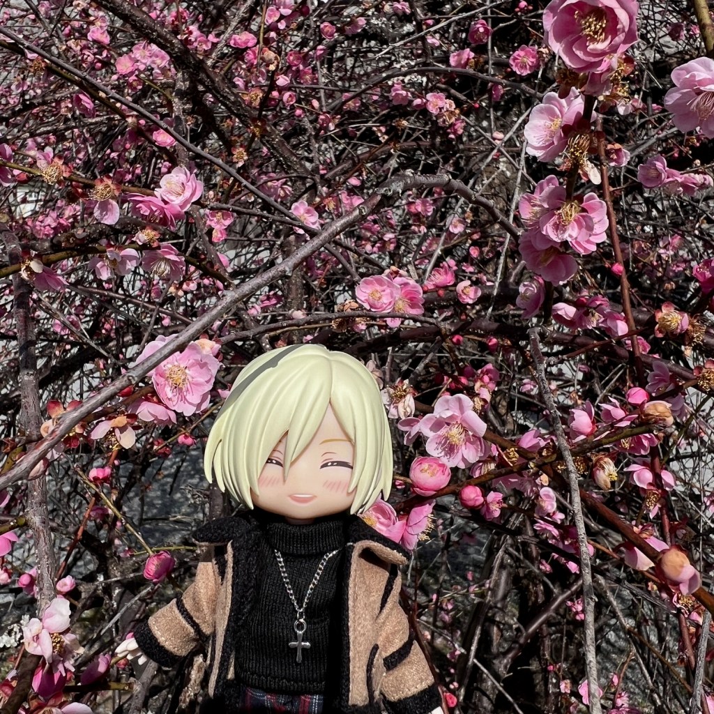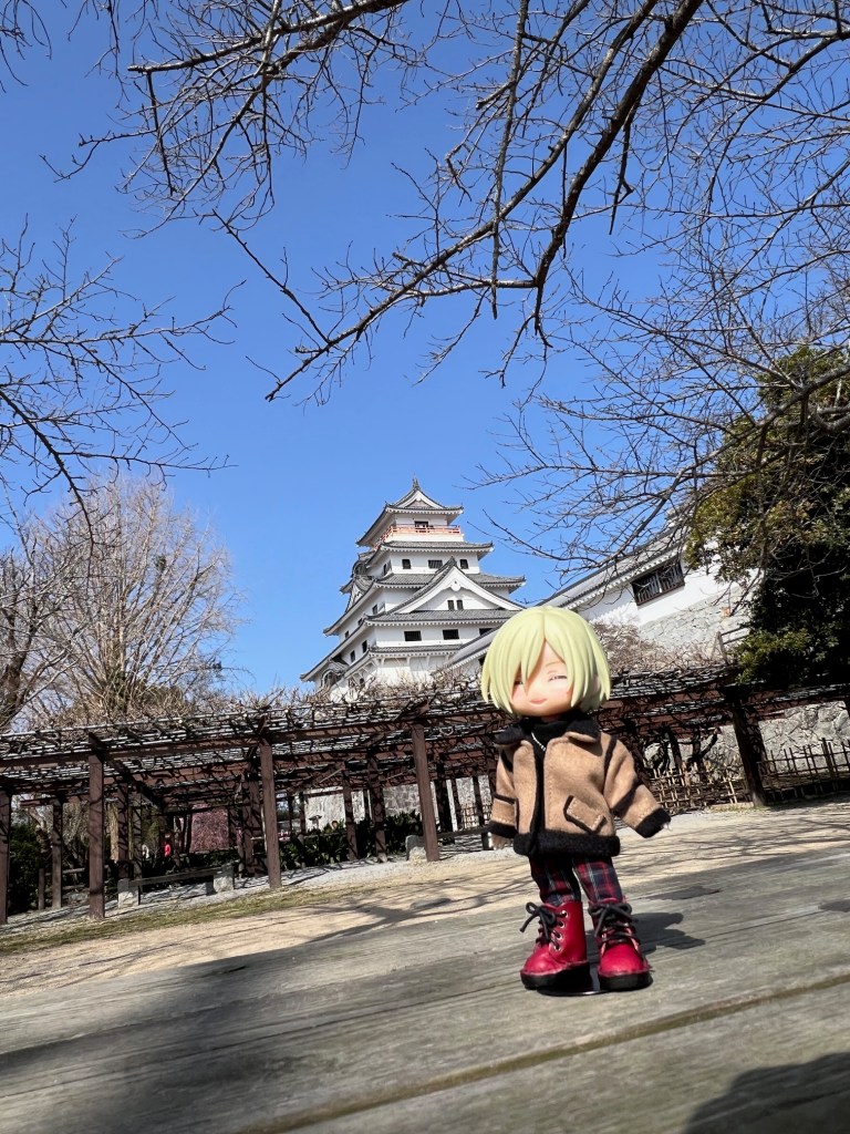 お城をもう少し近いところから見上げることができる場所に、大きな梅の木がありました。こちらでも満開だったので、ユーラチカと一緒に。下半身の方を持って枝に触れないよう近づけています。ぬいぐるみや1/12ドールだと、こういう風にさっと撮れるのが本当にありがたいなと思います。SDサイズとかで桜や梅と一緒に綺麗な写真を撮ってる方にずっと憧れている…。