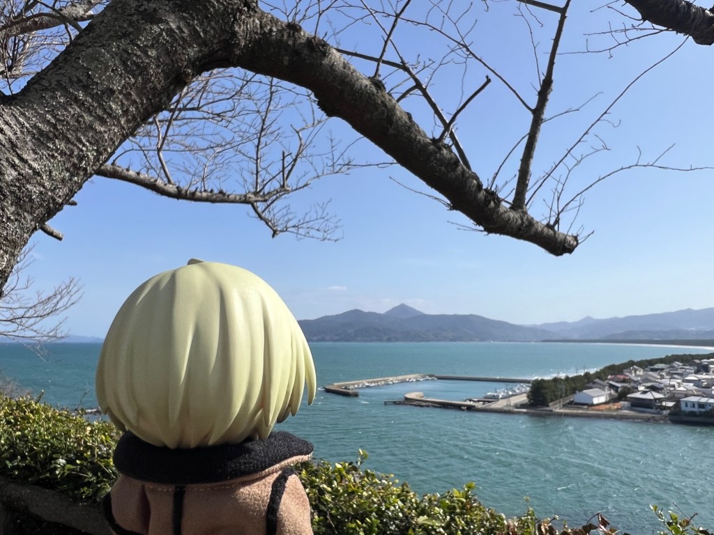 お城を背中に海(と、浜崎海岸)も見えます。この日は快晴の青空だったので、海もより青く見えてとっても綺麗!