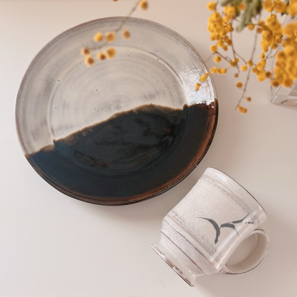 平皿の白と黒のコントラストがとっても気に入って、購入を決めました。岸岳焼は唐津焼の源流でもあるということで、手に取ることができて嬉しいです。白い釉から透けて見える土の風合いも感じていただけるのではないでしょうか。食事に使うのも良いけど、季節の草花を乗せて飾るのも良いかなと思っています。紅葉の枝やカラスウリの実なんか、赤が映えて良さそう。どちらも秋ですけど。カラスウリの実ってお花屋さんに売ってるのかな?